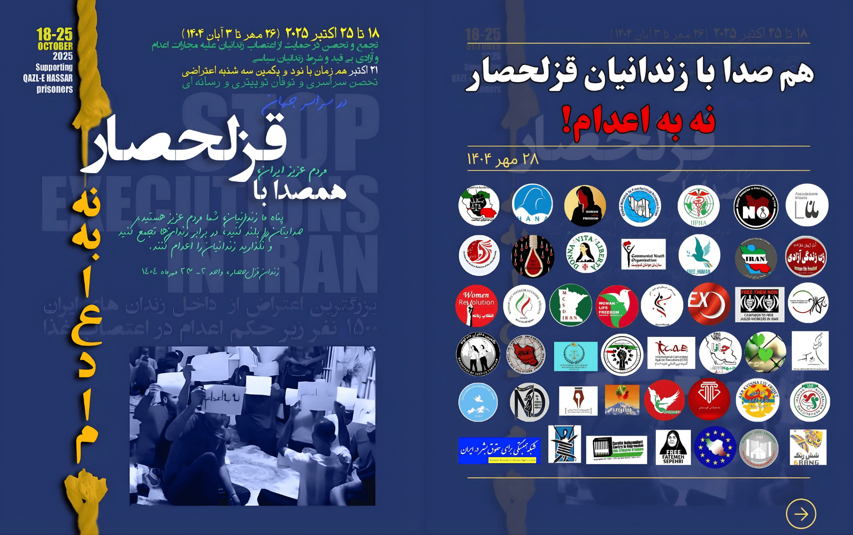 در هفتهی ۱۸ تا ۲۵ اکتبر، در هر جای دنیا و به هر شکل ممکن، از اعتصاب زندانیان قزلحصار علیه اعدام حمایت کنید. همچنین، روز سهشنبه ۲۱ اکتبر، همزمان با نود و یکمین هفتهی “سهشنبههای نه به اعدام”، شما را به شرکت در تحصن سراسری در کشورهای مختلف جهان علیه اعدام و برای آزادی زندانیان سیاسی فرا میخوانیم.