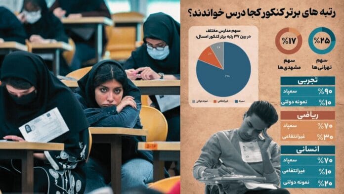برای فهم بهتر این خزعبلات رسانه‌ای، اول باید ببینیم داستان چیست. بر اساس گزارشات منتشر شده رتبه‌های برتر کنکور ۱۴۰۴، با اختلافی باورنکردنی بیشتر متعلق به دانش‌آموزان مدارس سمپاد هستند. در رشته تجربی ۹۰٪، در رشته ریاضی ۷۰٪ و در رشته انسانی ۷۰٪ برترین‌ها از سمپاد بوده‌اند. سهم مدارس نمونه دولتی و غیرانتفاعی بسیار کمتر است. همچنین ۲۵٪ رتبه‌های برتر تهرانی و ۱۷٪ مشهدی هستند.